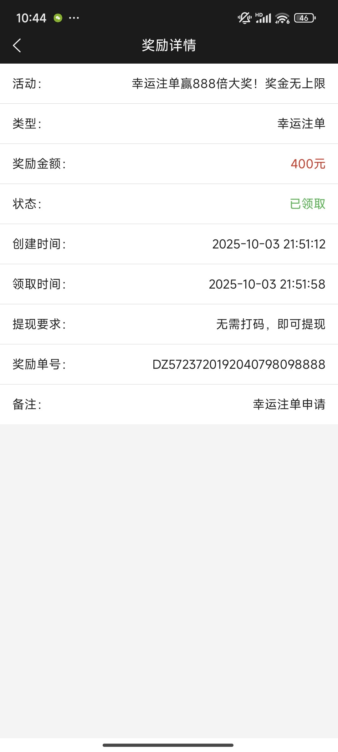我的也没发,今天662太难打了,200块本金,打到400,上不去,提款,杀光,充值,杀光,还好有幸运注单尾号8888,给了20倍,20块/注*20倍=400块,又打又杀,到现在回帖为止,还是400块,不打了,挣200休息算了。