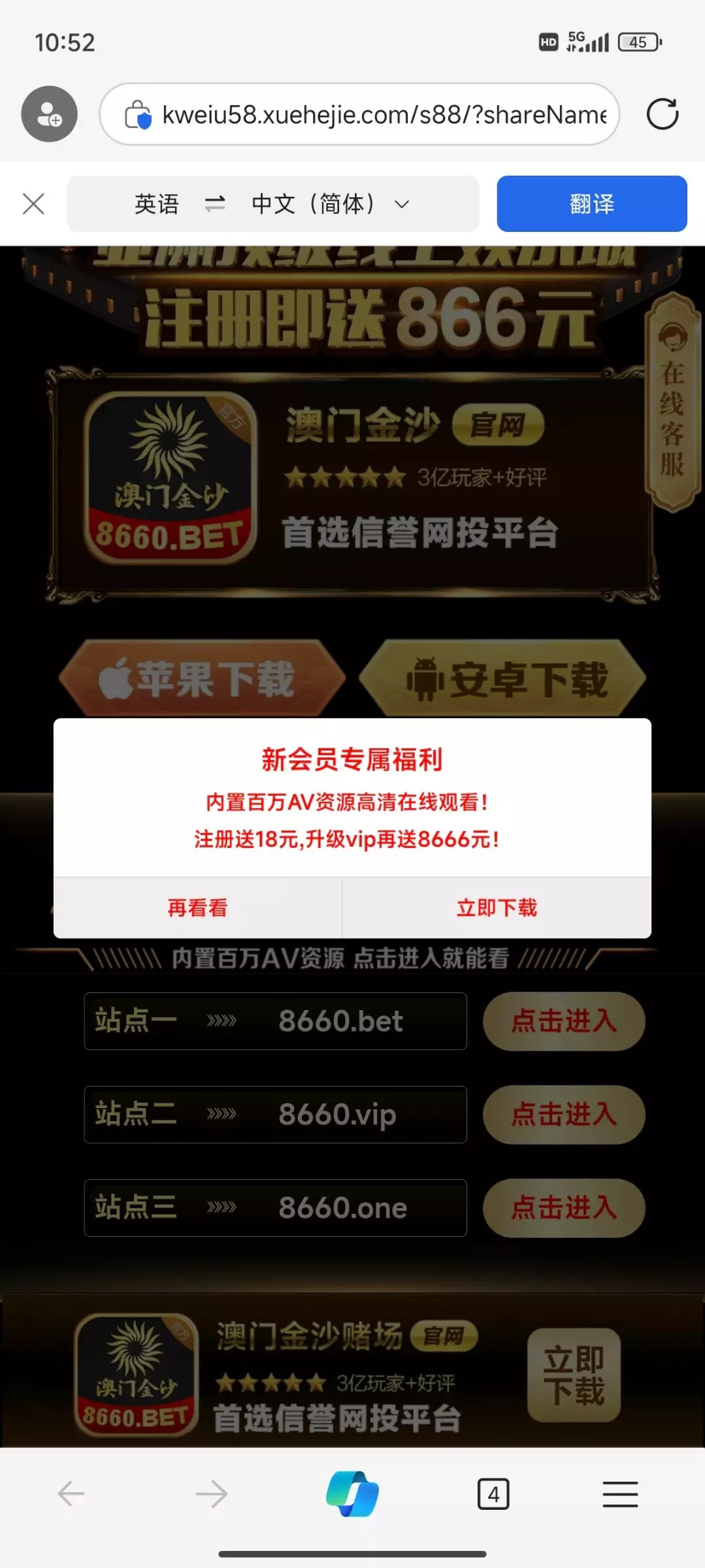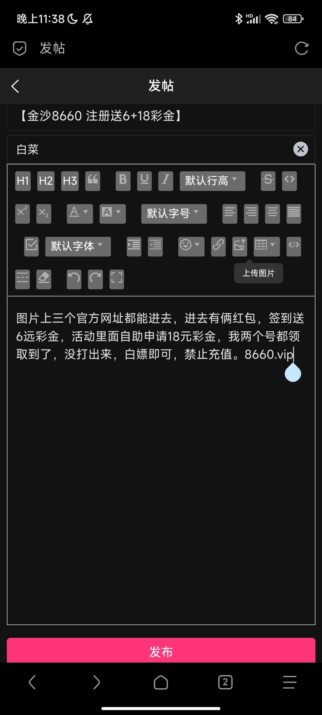 图片上三个官方网址都能进去,进去有俩红包,签到送6远彩金,活动里面自助申请18元彩金,我两个号都领取到了,没打出来,白嫖即可,禁止充值。8660.vip